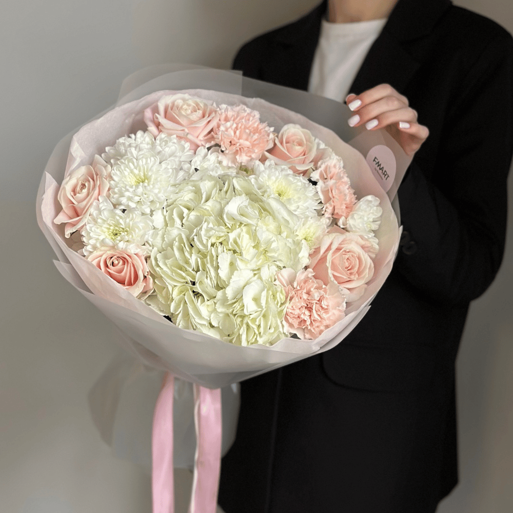 Этот удивительный авторский букет вобрал в себя всю красоту и элегантность природы. Гортензия, с ее нежными лепестками, символизирует благодарность и признательность. Хризантема, с ее множеством ле...