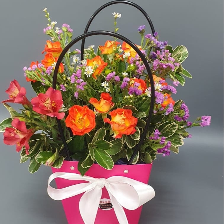 Букет с утонченным сочетанием цветов и разнообразием форм, создающих неповторимую гармонию. В его состав входят яркие альстромерии, элегантные кустовые розы, игривые ромашки и изящная статица. Этот букет прекрасно подойдет для подарка в любое время года или на любое торжество. Упакован в стильную упаковку — сумочку, которая придаст ему дополнительную изысканность и элегантность.