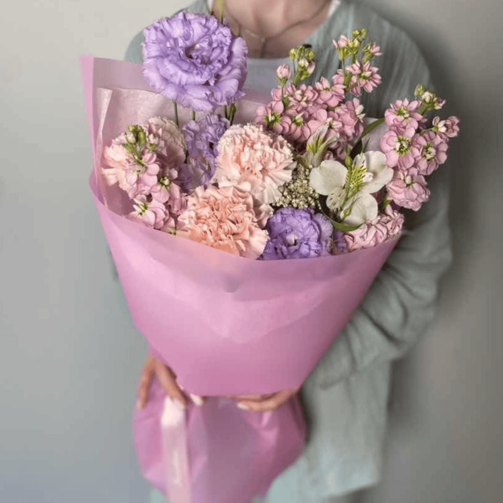 Прекрасный букет, состоящий из нежных маттиол, ароматных гвоздик, изысканных Лизиантус (Эустома), ярких альстромерий, упакованных в элегантную упаковку. Этот букет станет прекрасным подарком для любого праздника или повода, придавая особенный шарм и радость своему получателю.