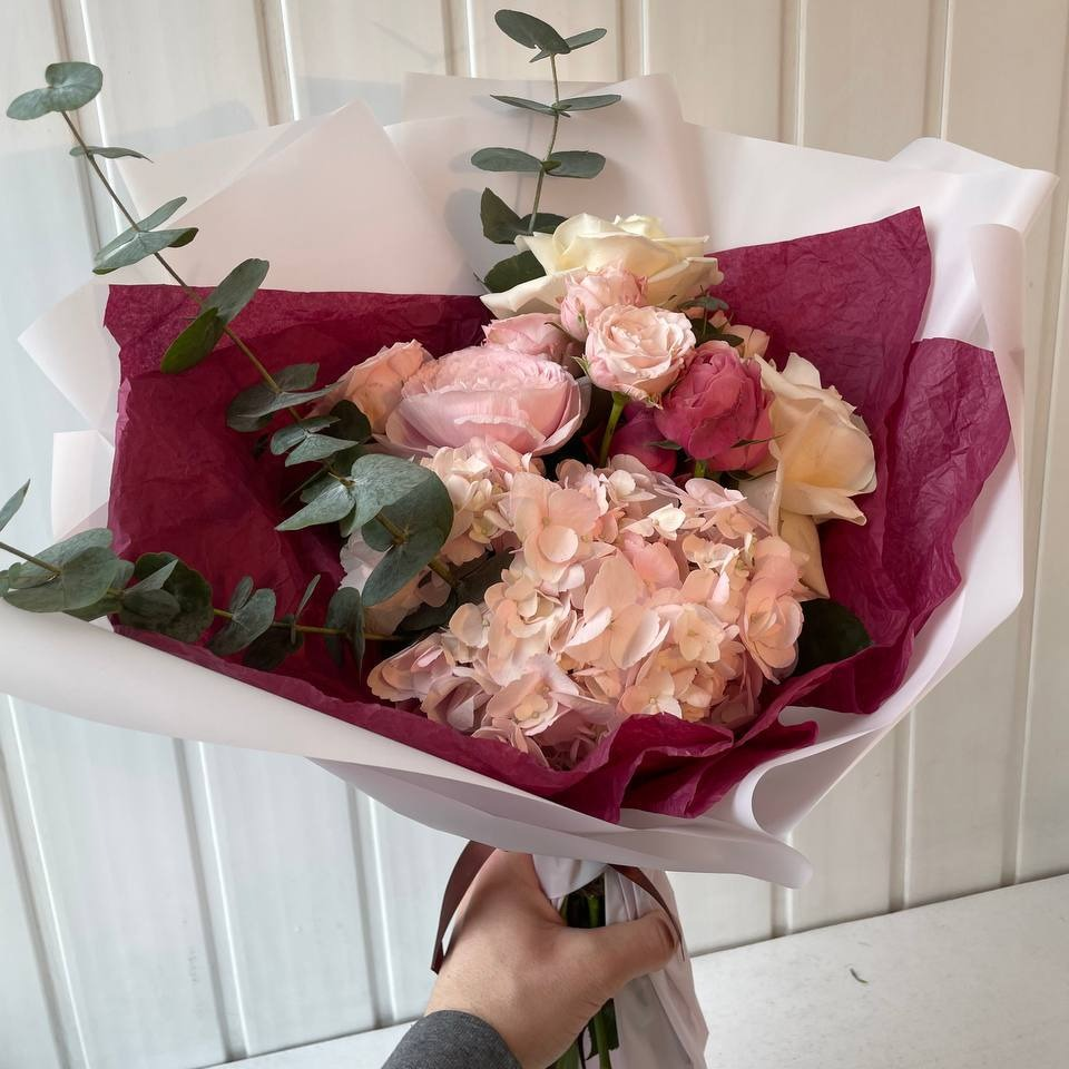 Этот букет отличается мягкой, романтичной палитрой оттенков — нежно-розовые и кремовые цветы создают атмосферу теплоты и тонкой женственности. В композиции использованы розы, ранункулюсы и гортензи...