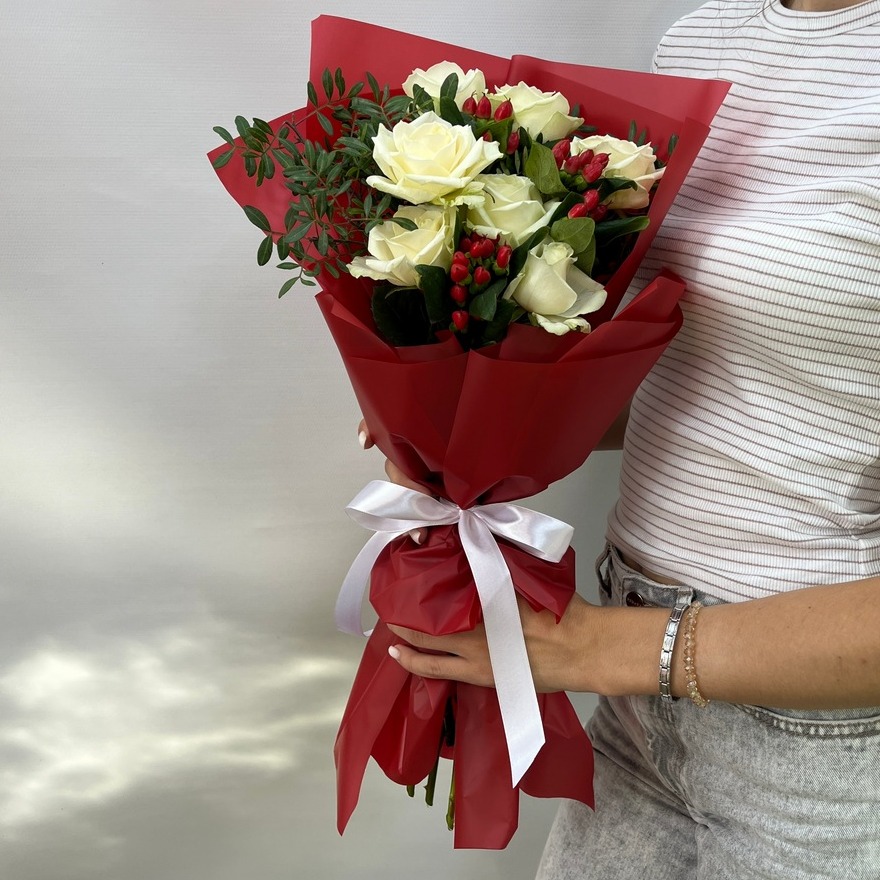 Состав букета: Авторская упаковка букета - 1 шт; Роза белая 60 см - 7 шт; Писташ - 2 шт; Гиперикум - 3 шт;
