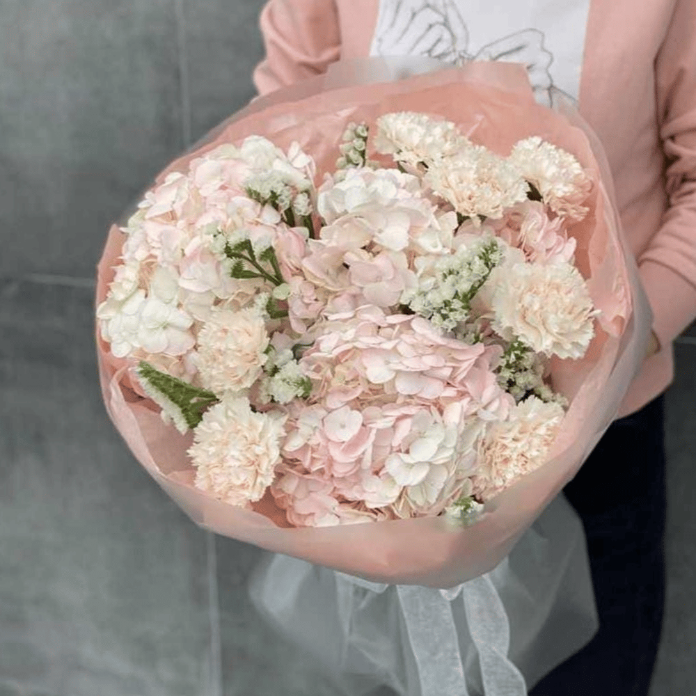 Авторский букет Нежность цвета из гвоздик и гортензий
