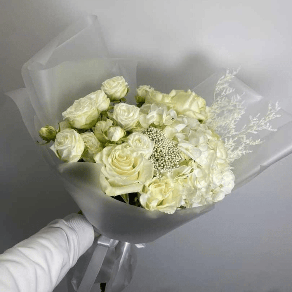 Авторский букет Оттенки белого из роз и гортензий