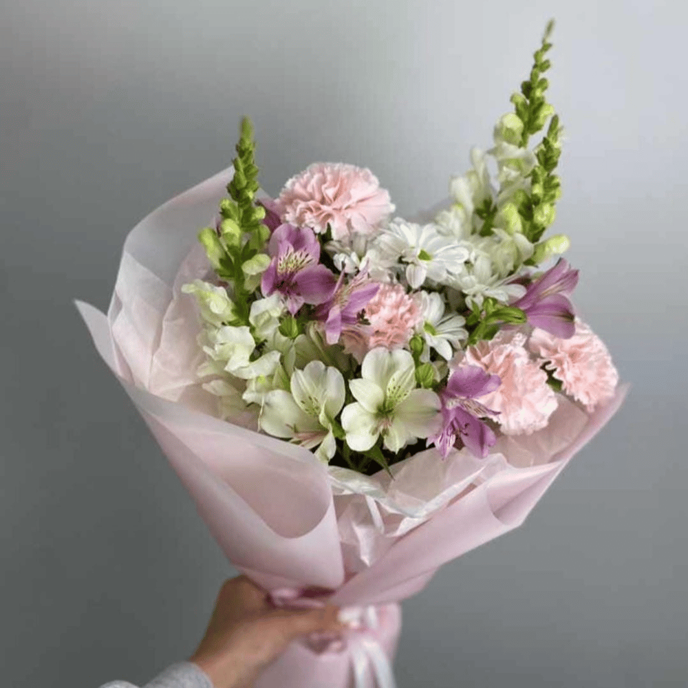 Букет с таким составом – это настоящая красота и изящество. Он представляет собой великолепное сочетание разнообразных цветов и текстур, которые добавят уют и радужные краски в любой интерьер. Гвоздики, с их насыщенными оттенками и красивым лепестком, добавят шарма и элегантности. Альстромерии с их множеством цветочных головок создадут ощущение бушующей красоты и пленительного аромата.Маттиола, с ее нежными лепестками и прекрасным запахом, придаст букету романтичности и запоминающейся ауры. Хризантема с сочными лепестками и интересной формой цветка, добавит изысканности и грации.