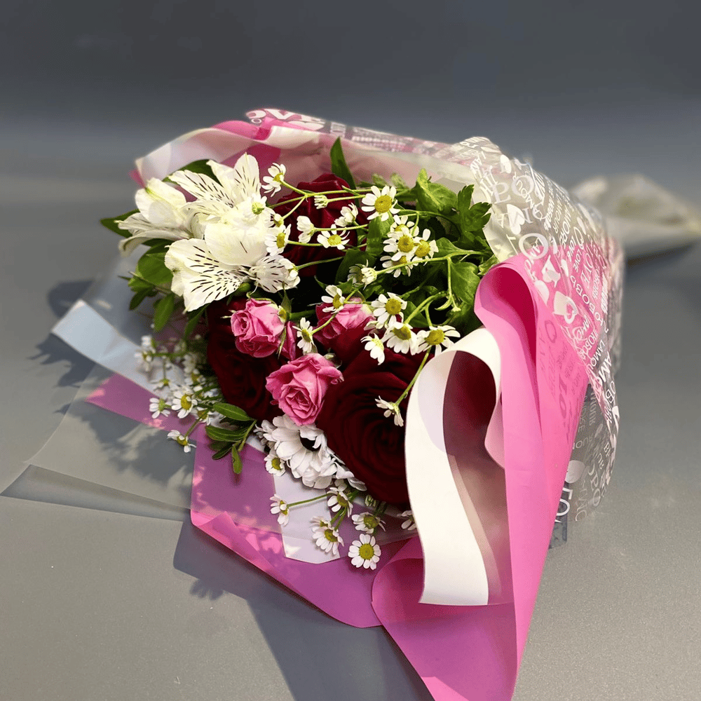 Букет, состоящий из замечательных цветов, подарит тепло и радость вашим близким. Он включает в себя изящные розы, красивые розы кустовые, нежные ромашки, яркие хризантемы кустовые и прекрасную альстромерию. Комбинация этих цветов создает великолепный ансамбль, который привлекает взгляд и наполняет пространство нежной ароматической атмосферой. Букет упакован в стильную и элегантную упаковку, что делает его готовым к подарку. Этот букет станет идеальным выбором для любого случая, будь то день рождения, юбилей, свадьба или просто проявление заботы и любви.
