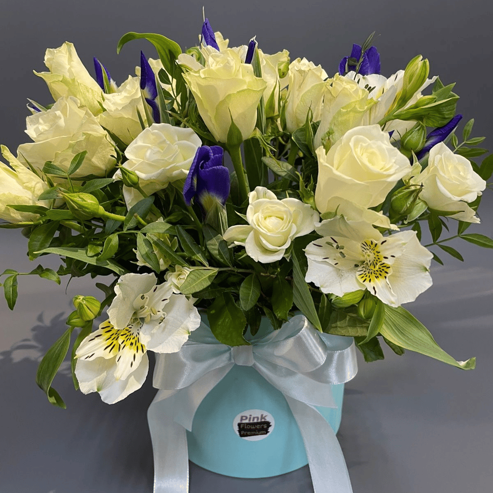 Букет в коробке с розами, кустовыми розами, ирисами и альстромериями - это изысканное и изящное сочетание прекрасных цветов и оригинальной упаковки. Благодаря своему разнообразию, букет выглядит пышным и роскошным. Упаковка в виде коробки придает букету особую изысканность и шарм, увеличивая его элегантность. Этот букет станет прекрасным подарком для любого случая и порадует глаз своей нежностью и красотой.