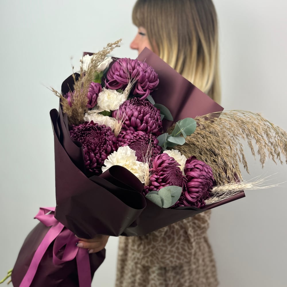 Авторский букет с диантусами из хризантем и гвоздик