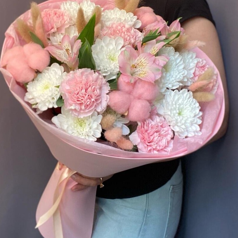 Авторский букет с лагурусами и хлопком из хризантем и альстромерий