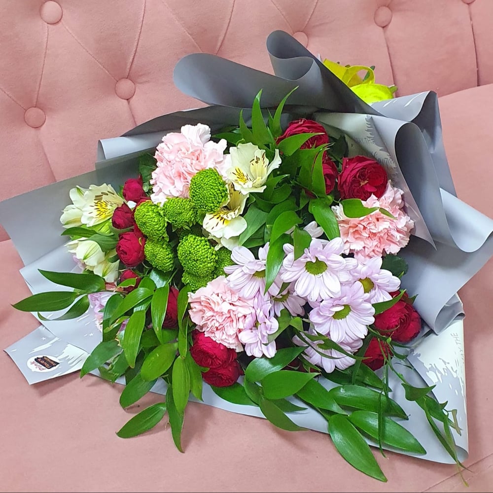 Этот роскошный букет сочетает в себе красоту роз, гвоздик, альстромерий, хризантем и сочных веточек флористической зелени, создавая идеальное сочетание элегантности и свежести. Композиция в дизайне...