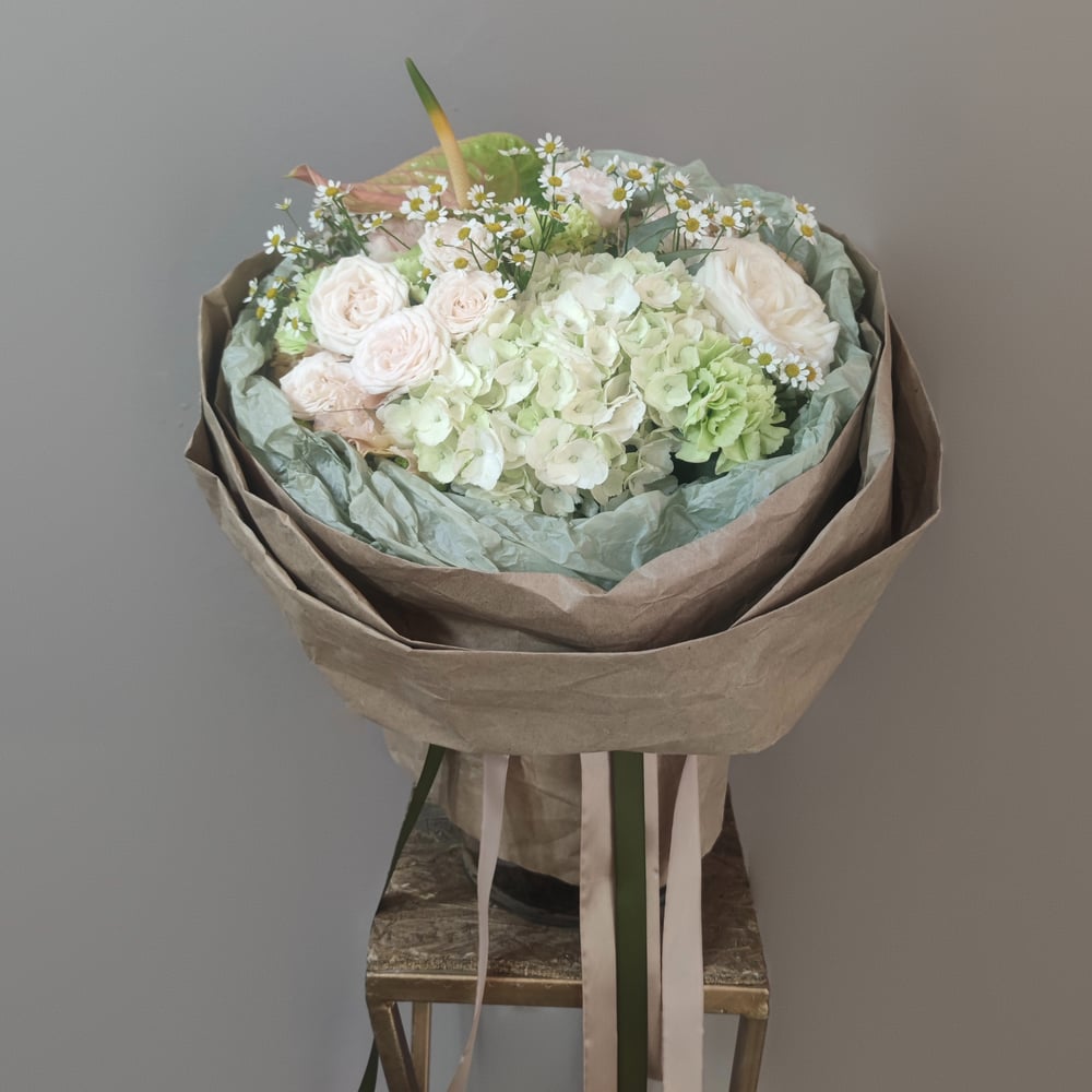 Авторский букет с гортензией и антуриумом в дизайнерской упаковке.