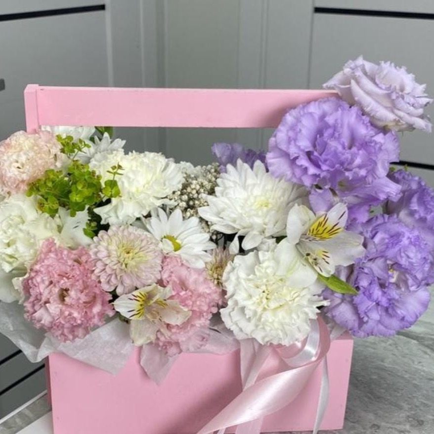 Этот утонченный букет содержит красивые и нежные цветы: лизиантус, хризантему и альстромерию, собранные в стильную коробку. Этот букет идеально подойдет для подарка на особый случай или просто для ...