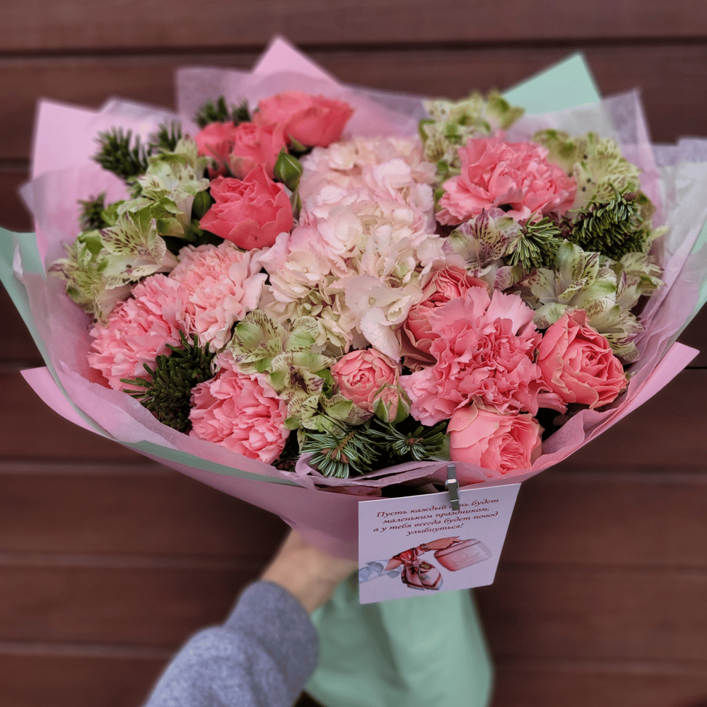 Стильный букет в розово-зелёных оттенках