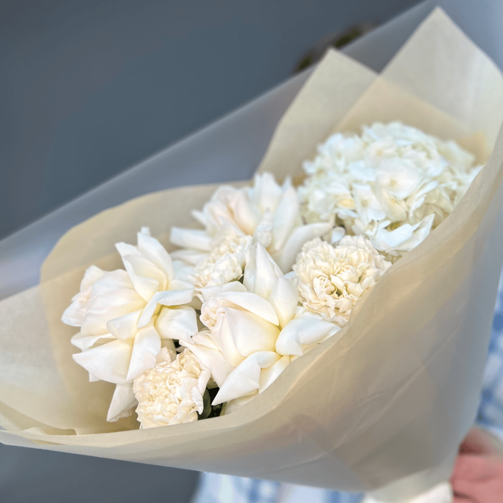 Представляем Вам волшебный букет, способный покорить сердце. В нем идеально сочетаются три великолепных цветка - роза, гортензия и диантус. Роза - символ любви, страсти и восхищения. Ее нежные лепестки окутывают гортензию, придавая букету изысканность и грацию. Гортензия добавляет букету легкости и свежести, а ее пышные соцветия подчеркивают красоту и нежность других цветов. Диантус, или гвоздика, символизирует преданность и уважение. Такой букет станет незабываемым подарком на любой праздник. Он прекрасно подойдет для выражения своих чувств, признательности или просто в качестве знака внимания. Не отказывайте себе в удовольствии подарить радость и счастье своим близким с помощью этого восхитительного букета из розы, гортензии и диантуса. Позвольте Вашим чувствам говорить на языке цветов, и Ваше послание обязательно будет услышано.
