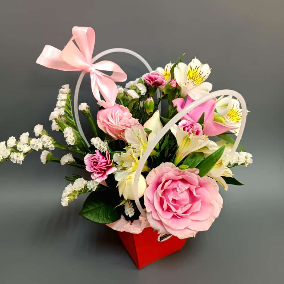 Цветочная композиция с разнообразным составом в нежных оттенках, упакованная в сумочку. Такой букет станет отличным презентом для любого повода и украсит интерьер.
