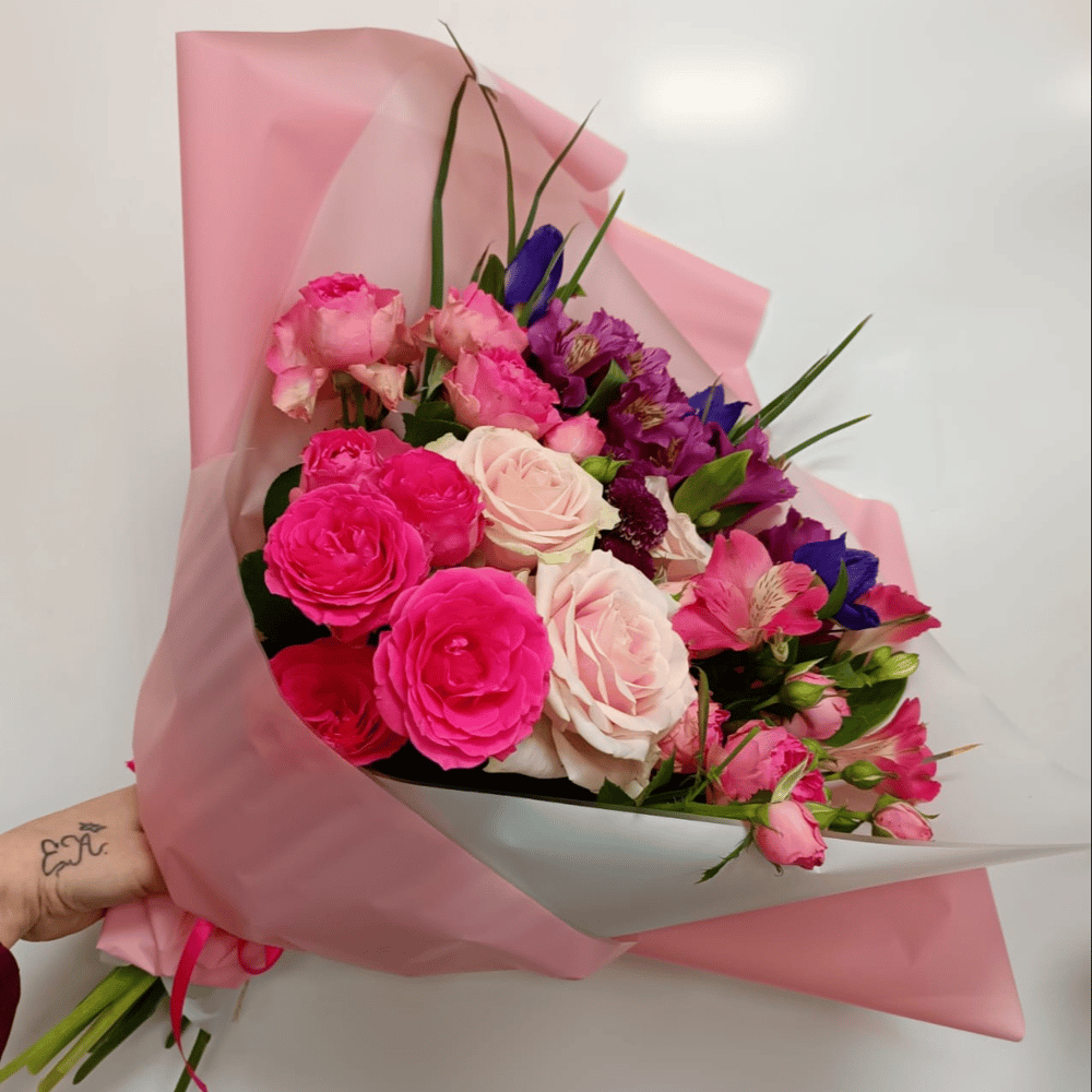 Этот удивительный букет включает в себя нежные и красивые цветы: розы, розы кустовые, альстромерии, ирисы и хризантемы кустовые. Каждый цветок в этом букете символизирует любовь, красоту, нежность ...