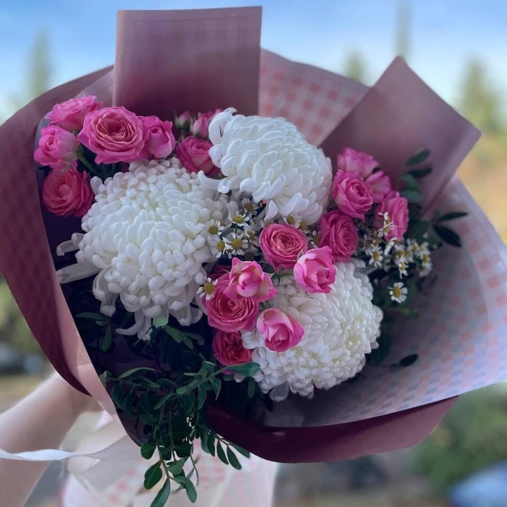 Букет, состоящий из элегантных кустовых роз, изящных ромашек и нежных хризантем, упакован в стильную упаковку и украшен лентой. Этот букет подойдет для любого случая - от поздравления с днем рожден...