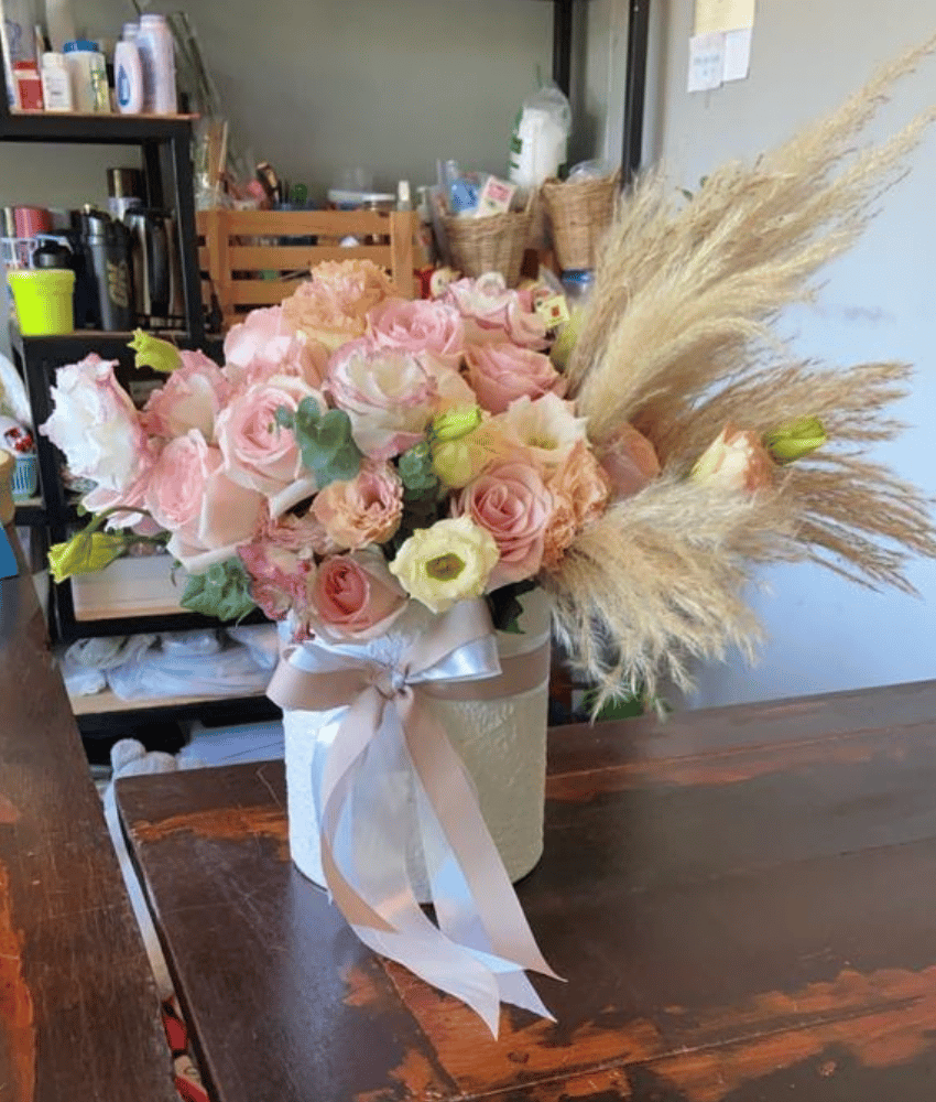 Шляпная коробка с цветами «Азалия» из роз и эустом