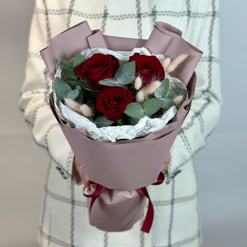 Красные розочки с эвкалиптом и лагурусом