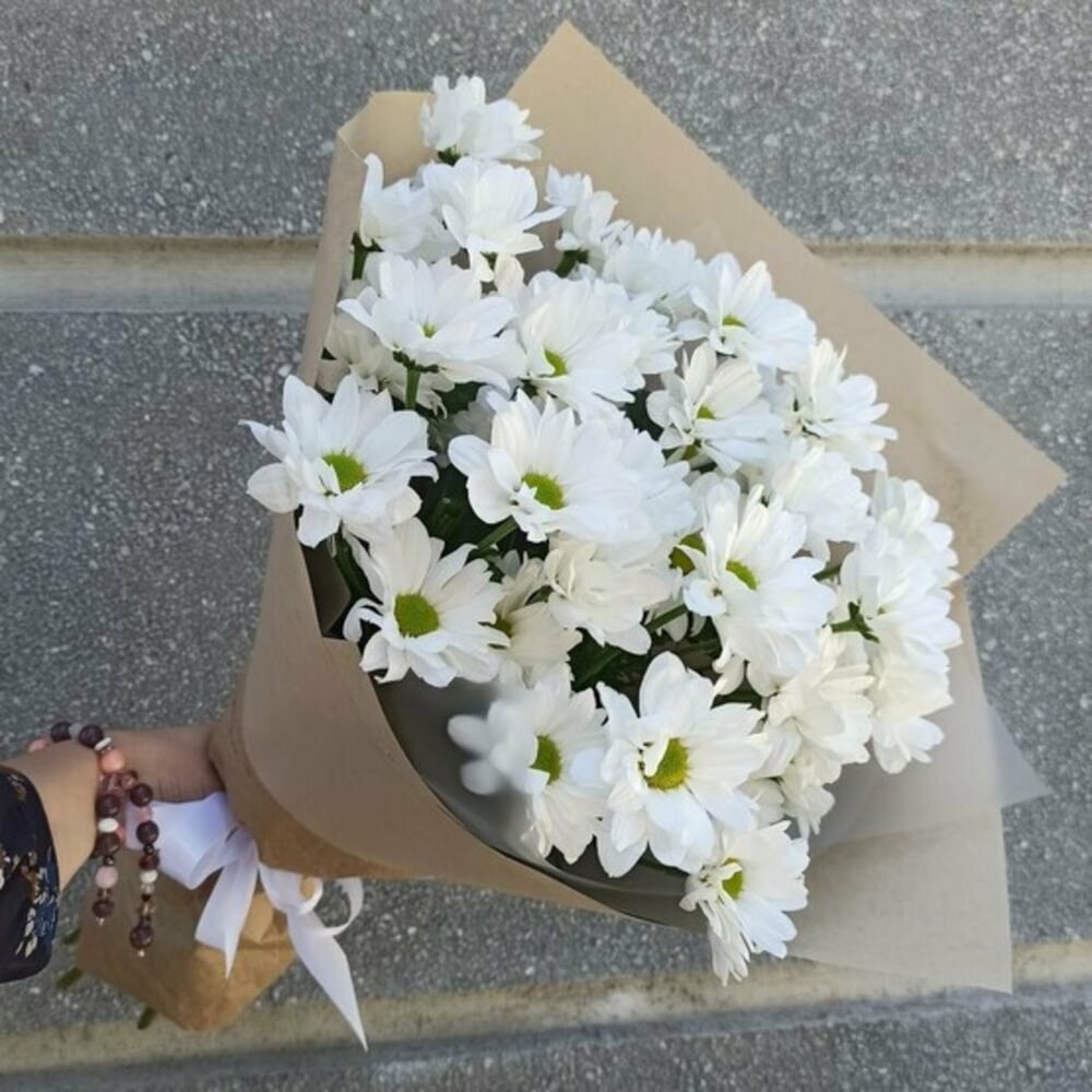 Букет из 5 белых ромашковых хризантем в крафт-бумаге