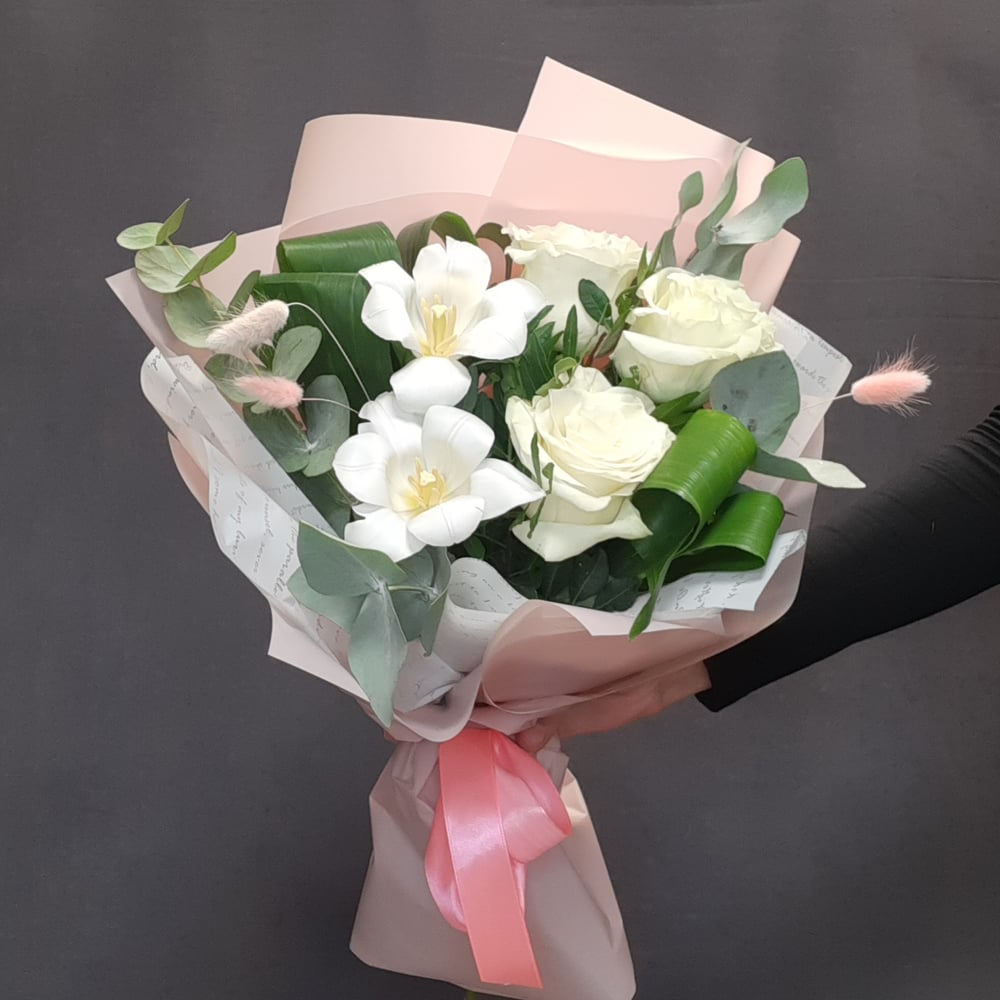 Воздушный, грациозный, необычный букет выпоненный в современной технике порадует даже обладательницу самого взыскательного вкуса!