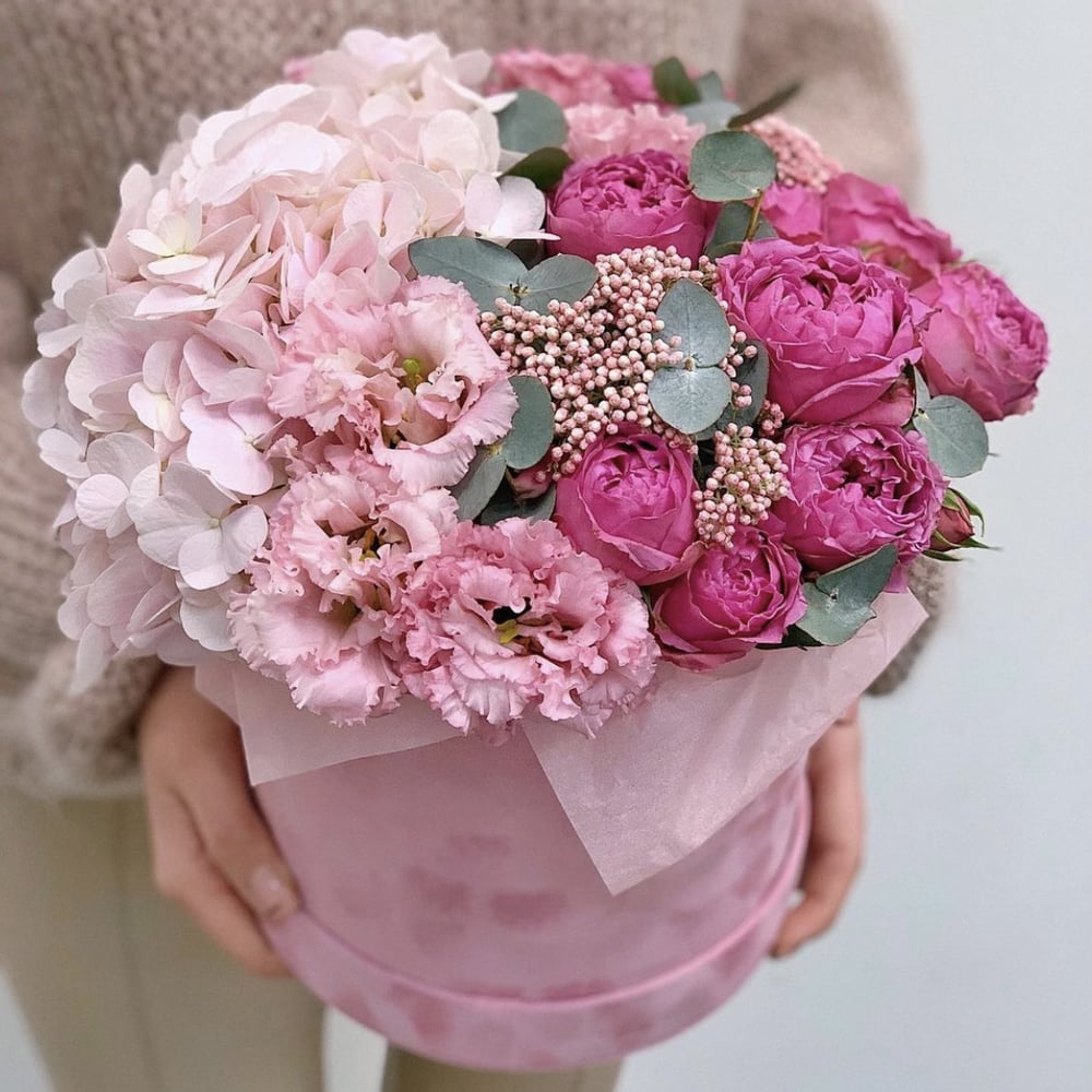 Шляпная коробка с цветами «Балерина» из эустом и гортензий