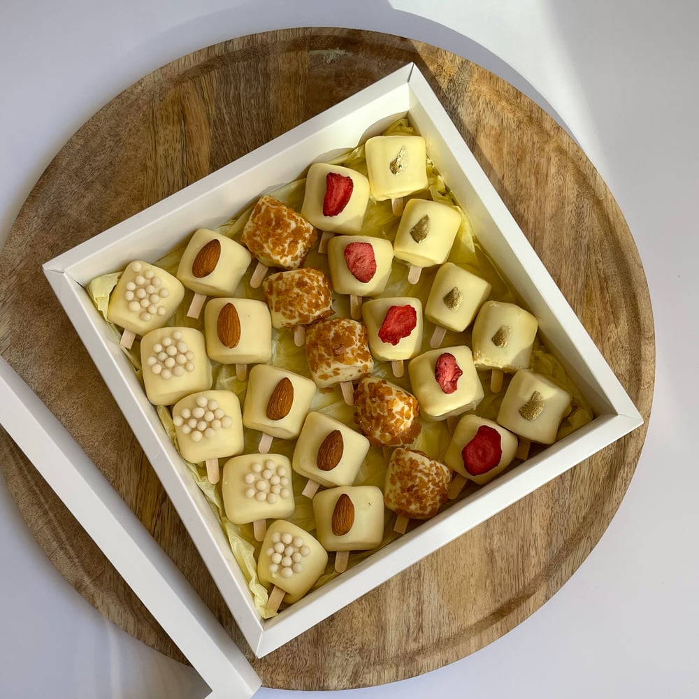 Состав: — 5 кусочков банана в белом шоколаде, декор миндаль цельный — 5 кусочков банана в белом шоколаде, декор сублимированная клубника слайсы — 5 кусочков банана в белом шоколаде, декор шоколадные шарики — 5 кусочков банана в белом шоколаде, декор золотой кандурин — 5 кусочков банана в белом шоколаде, декор вафельная крошка Примечание: — Набор имеет прозрачную крышку и перевязан атласной лентой с бантом — Размеры упаковки 23*23 см. — Натуральный продукт. Срок годности бананов в шоколаде до 24-48 часов. Храните в холодильнике при температуре +4..+8 градусов