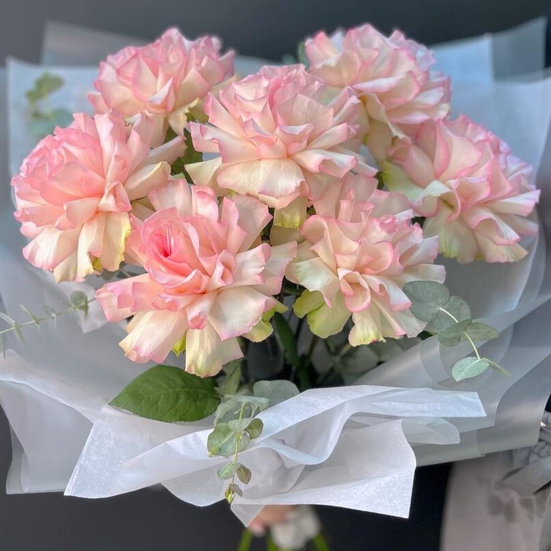 Пышный, стойкий букет из французских роз с эвкалиптом, аромат которого напомнит вам хвою. Ваш букет мы обязательно дополним кризалом и инструкцией по уходу за цветами, а также, с радостью подпишем открытку с вашими пожеланиями🌿 Замечательным дополнением к букету может стать красивая ваза, соль для ванны, бомбочка или диффузор ручной работы🌺 Желаем приятных покупок!