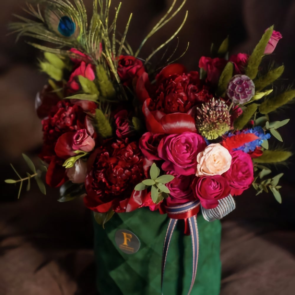 Шляпная коробка с цветами «Бархатная коробка Гранат» из пионов и роз