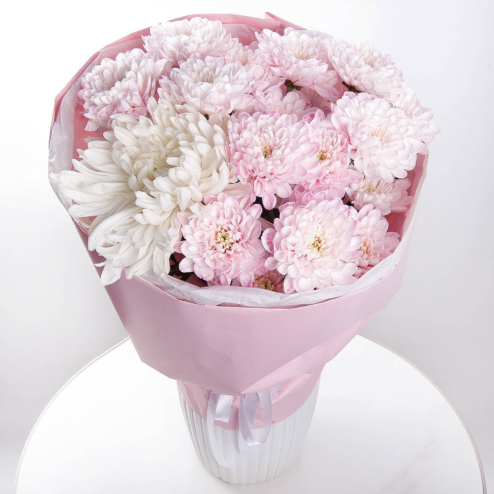 Этот букет - олицетворение мягкости и утонченности. Сочетание кустовых и одиночных хризантем создает гармоничную и нежную композицию. Упакованный в современную упаковку, этот букет подарит ощущение бархатной нежности и выразит ваши самые искренние чувства.