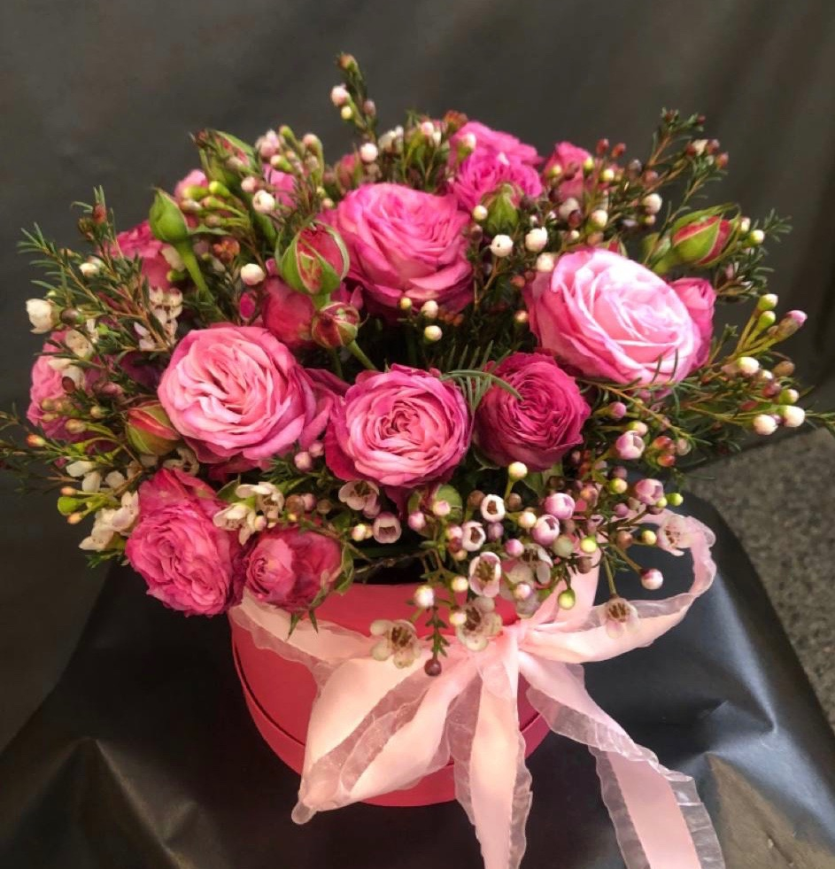 Ароматные кустовые розы в сочетании с хамелациумом подарят ощущение и аромат весны.