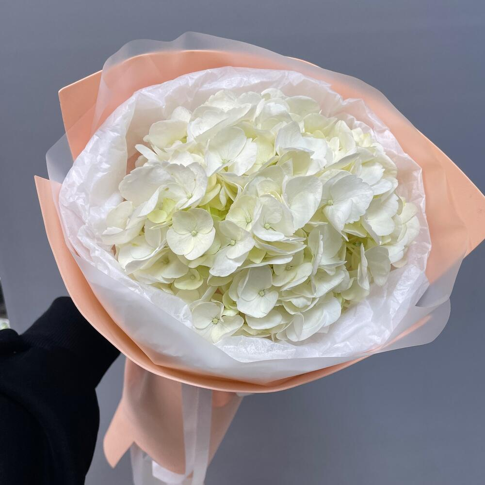 Букет из белой гортензии в упаковке Этот изысканный букет из белой гортензии — символ чистоты, нежности и элегантности. Объемные, пышные соцветия создают ощущение роскоши и свежести, придавая лю...