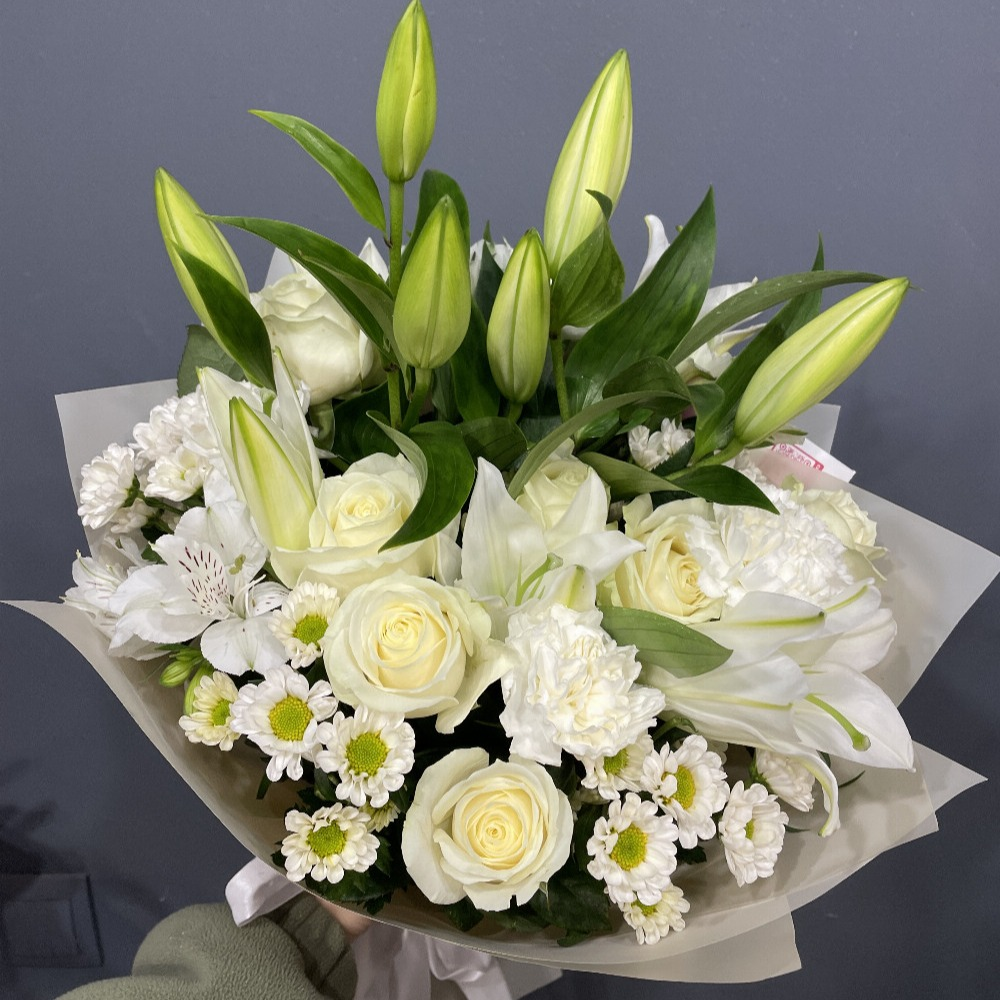 Букет «Белая ночь» из роз и хризантем
