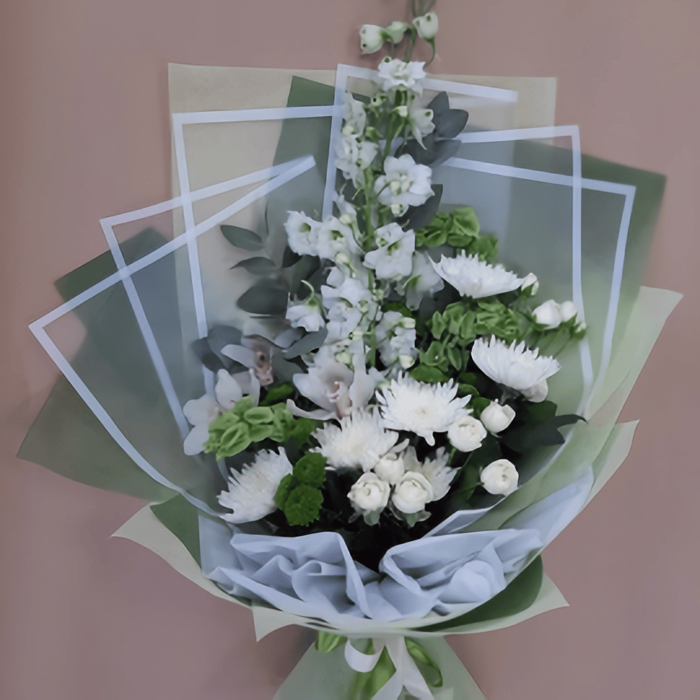 Этот букет состоит из ароматной матиолы, белой орхидеи , белой хризантемы и кустовой зеленой хризантемы, упакованно в стильной бело-зеленой матовой упаковке. Отлично подойдет для поздравления деловог…
