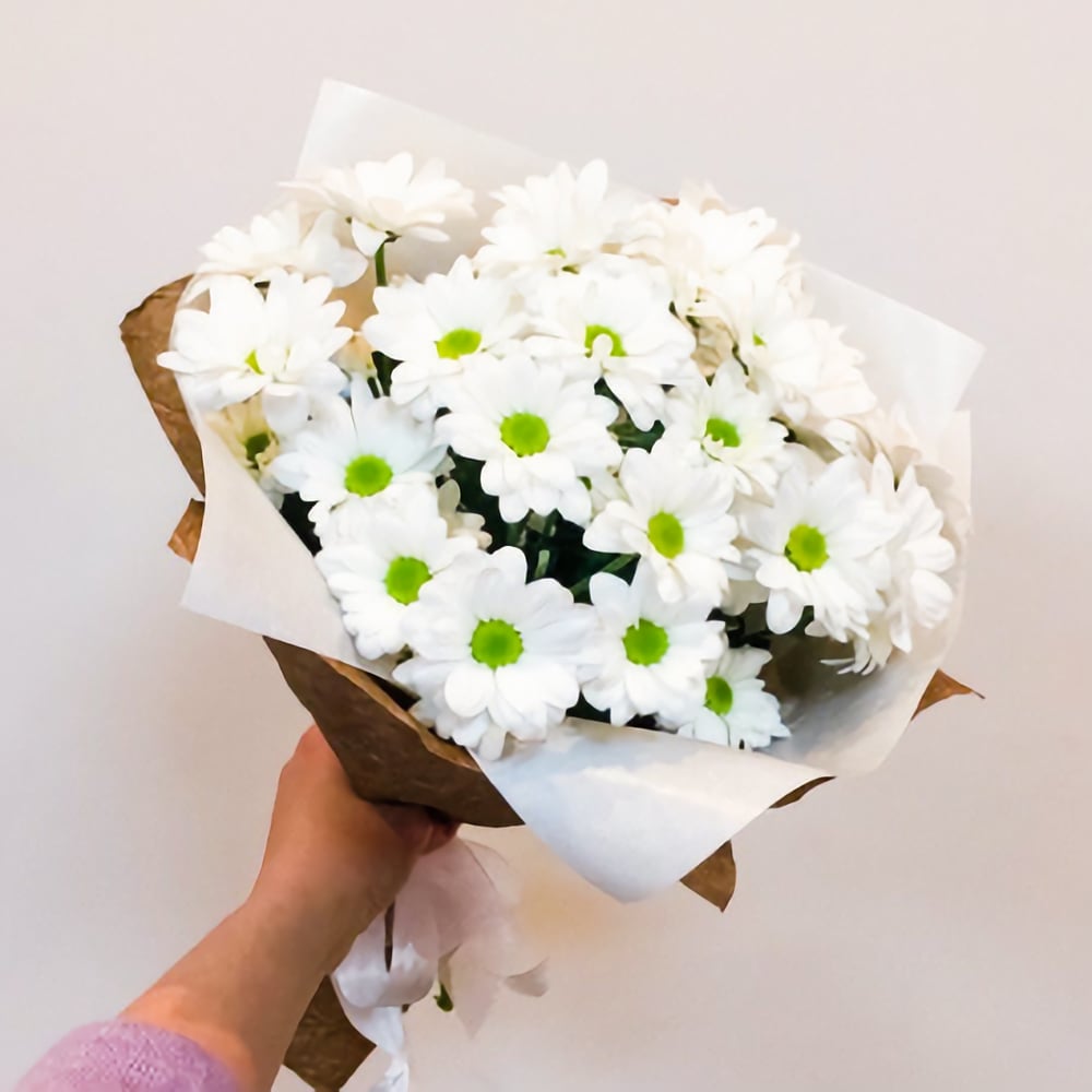 Этот очаровательный букет из белоснежных ромашковых хризантем окутает вас воспоминаниями о душистом летнем поле, согреет теплым солнечным светом и унесёт к мечте на крыльях лёгкого ветерка.