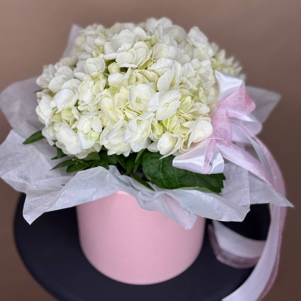 Шляпная коробка с цветами «Белое облачко» из гортензий