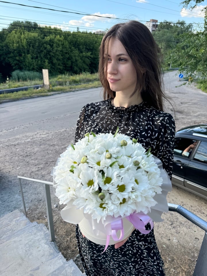 Шляпная коробка с цветами «Белое облако» из хризантем