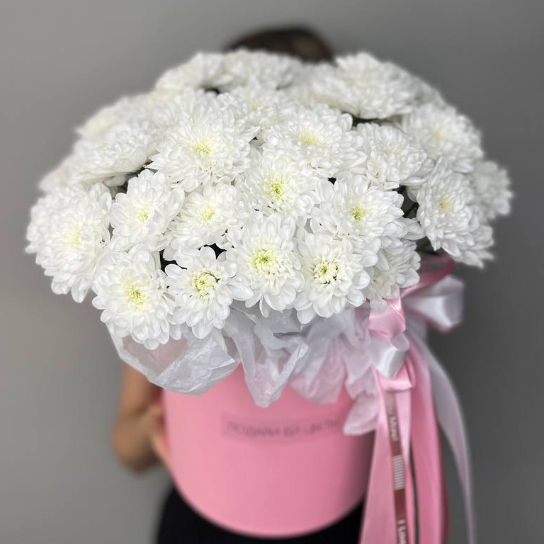 Прекрасный букет из 7 кустов хризантем упакован в нежное тишью и представлен в стильной шляпной коробке. Цветы дополнительно зафиксированы в оазисе, чтобы сохранить свежесть и красоту. Атласная лента придает композиции особую изящность и завершает ее элегантный вид. Идеальный подарок для особого человека!