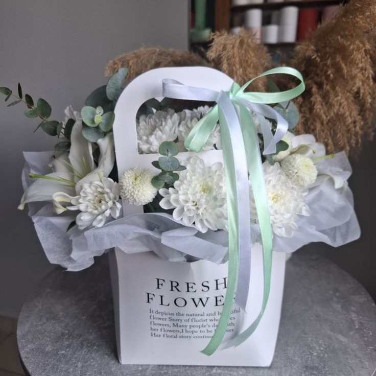 Белые хризантемы ,белые лилии и эвкалипт