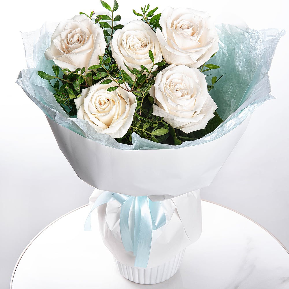 Элегантные белые розы и фисташка в современном оформлении придают букету особое очарование. Этот стильный букет будет прекрасным акцентом для любого торжества, создавая атмосферу свежести и утонченно…