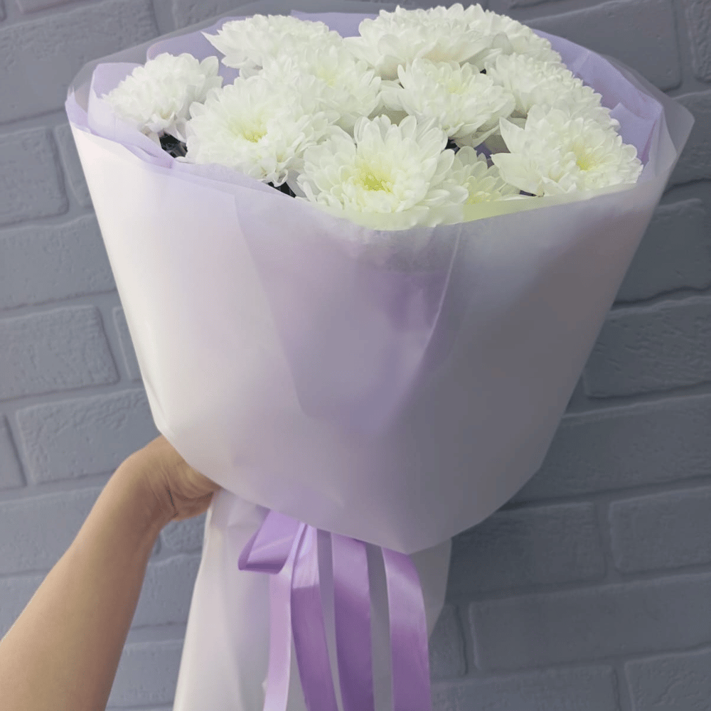 Букет из нежных белоснежных хризантем оформленный в воздушно-матовую упаковку сиреневого оттенка