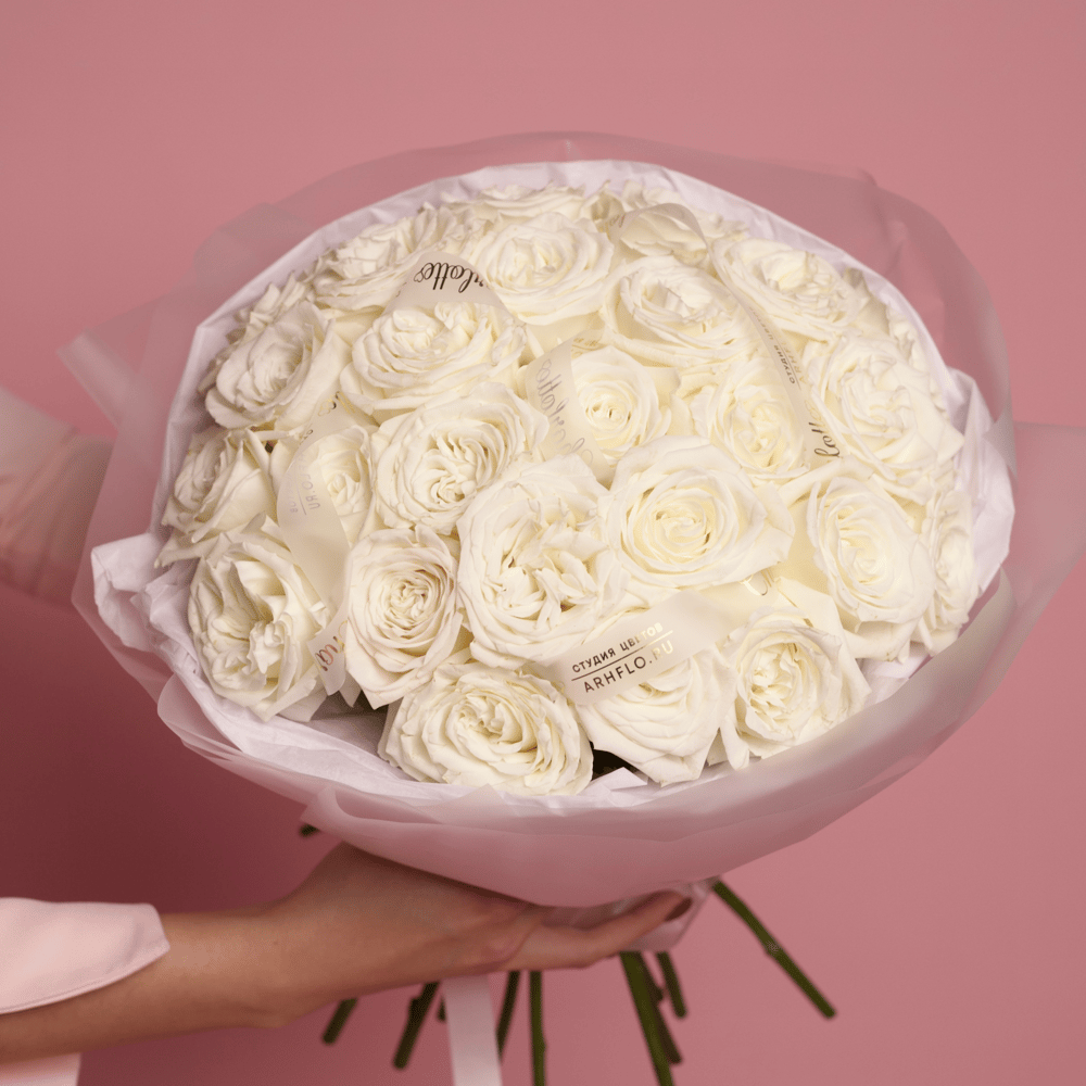 Букет из 25 белых пионовидных роз в фирменной упаковке Charlotte