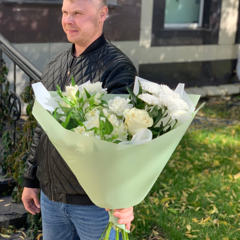 Букет «Белоснежный микс» из гвоздик и альстромерий