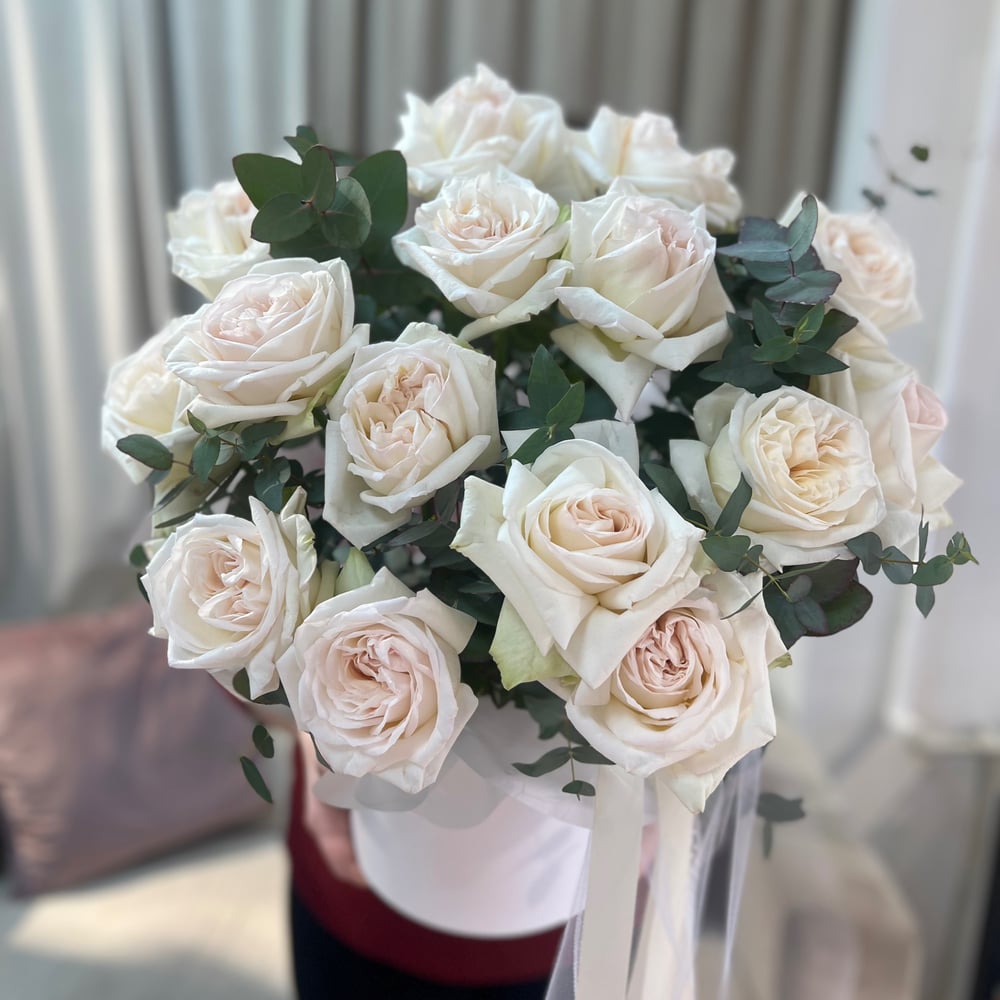 Прекрасный букет, состоящий из элегантных белых роз вайт охара и ароматного эвкалипта. Благодаря упаковке в шляпную коробку с оазисом, этот букет будет долго радовать своего получателя своей свежестью и красотой. Он станет прекрасным подарком для любого праздника или просто для того, чтобы порадовать близкого человека.