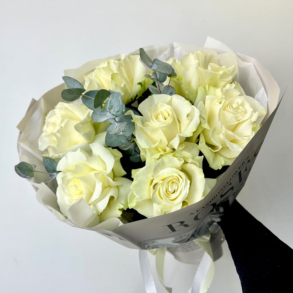 Букет из белых роз в стильном оформлении с добавлением зелени эвкалипт