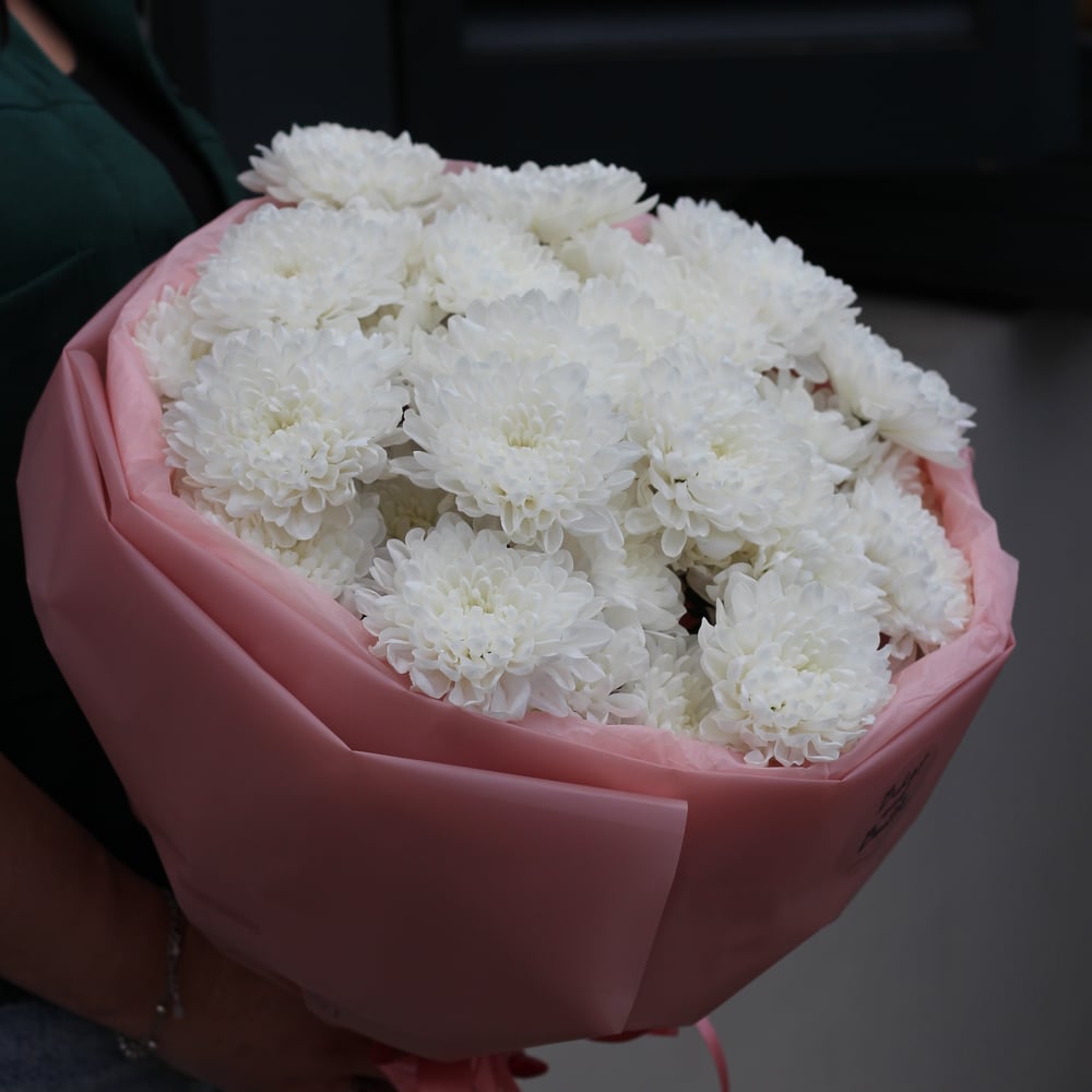 Облако белых хризантем в розовой упаковке. Стойкий букет, нежный.