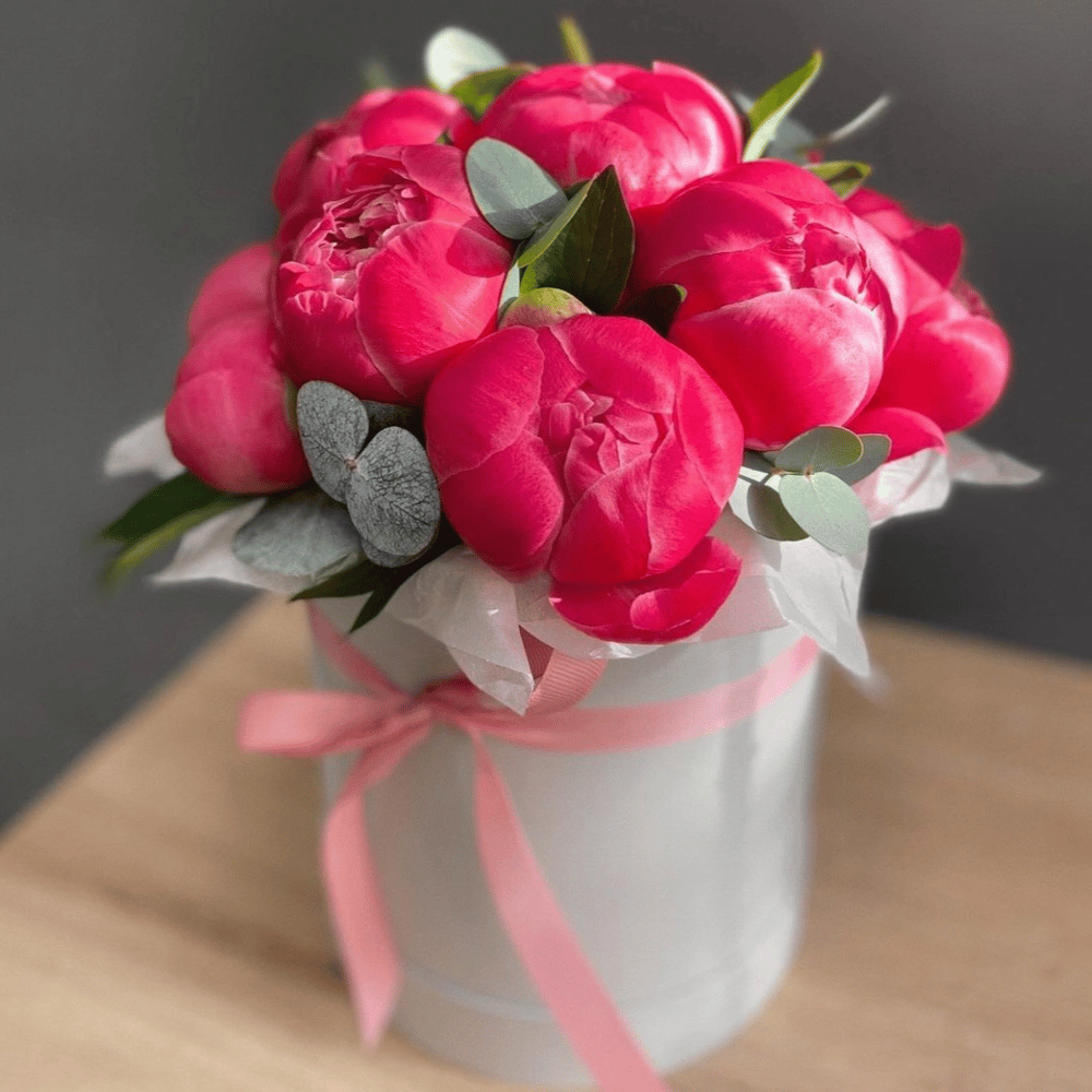 Шляпная коробка с цветами «Белые Московские ночи» из пионов