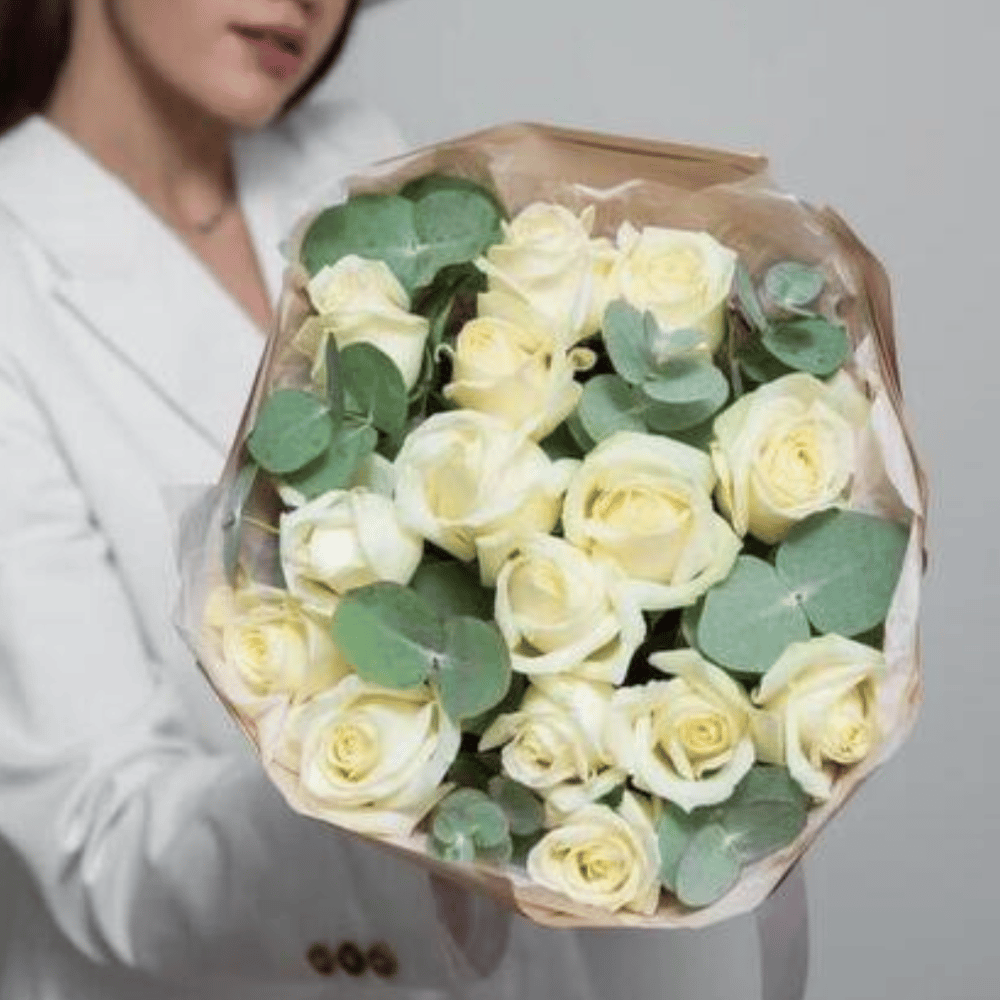 Этот элегантный букет из нежных белых роз станет идеальным подарком для любого повода. Изящные розы, завернутые в стильную упаковку и дополненные свежей зеленью эвкалипта, создают гармоничный и утонченный образ. Подарите своим близким нежность и красоту с этим великолепным букетом. Прекрасно подходит для романтических свиданий, дней рождения и других торжественных событий