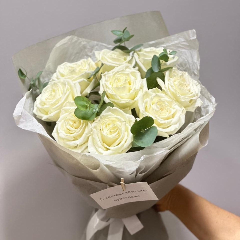 Букет «Белые розы с эвкалиптом 9 шт»
