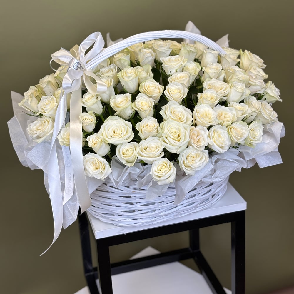 Роскошный букет из 75 белых роз в элегантной корзине станет прекрасным подарком для любого торжества. Нежные белоснежные бутоны, собранные в пышную композицию, излучают свежесть и изысканность, соз...