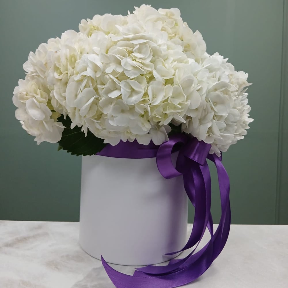 Шляпная коробка с цветами «Белый ангел» из гортензий